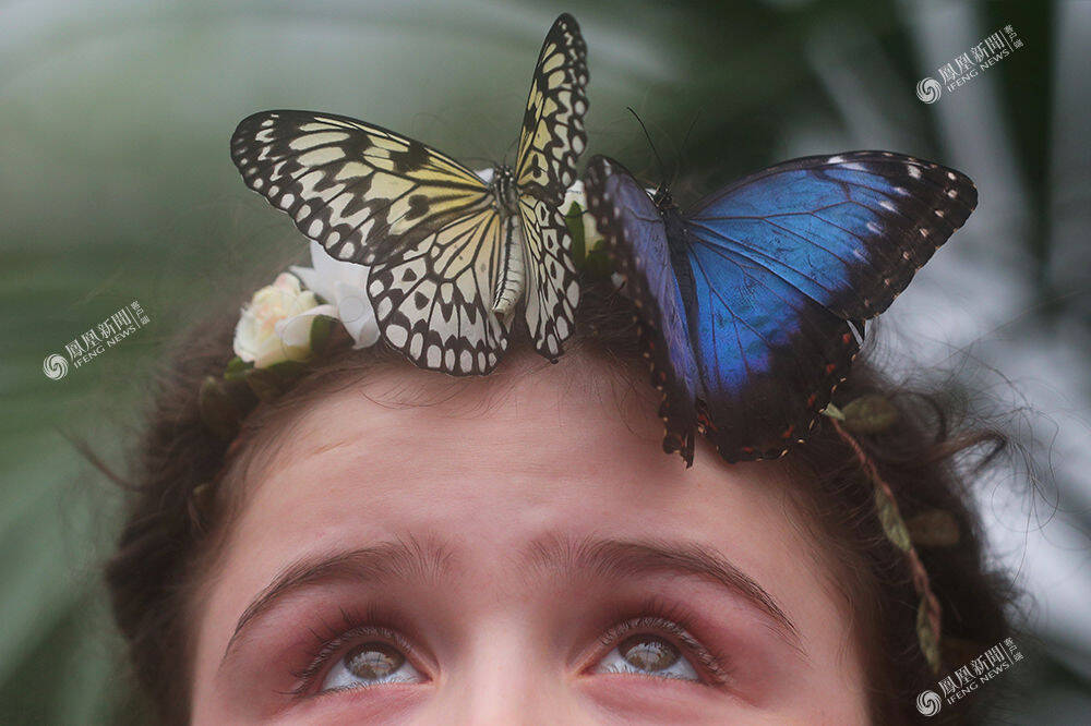 2018年3月28日,英国伦敦的自然历史博物馆,蝴蝶停在一名十岁男孩的头上。