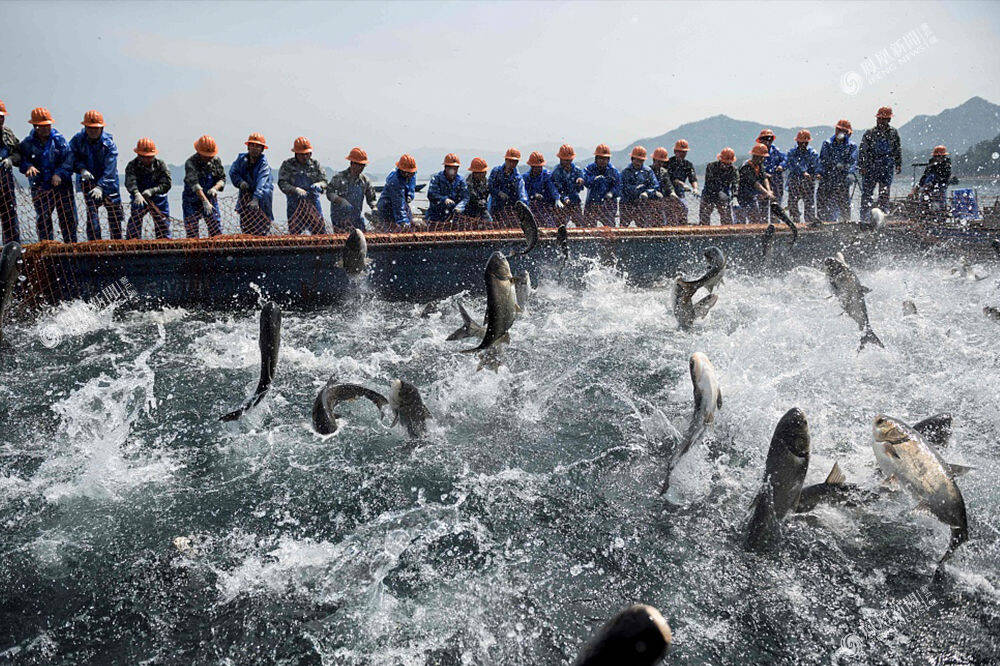 2018年3月29日,浙江千岛湖,二十几个工人收紧巨网,数万斤鱼翻腾起来。Johannes EISELE/摄