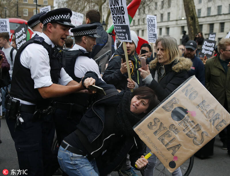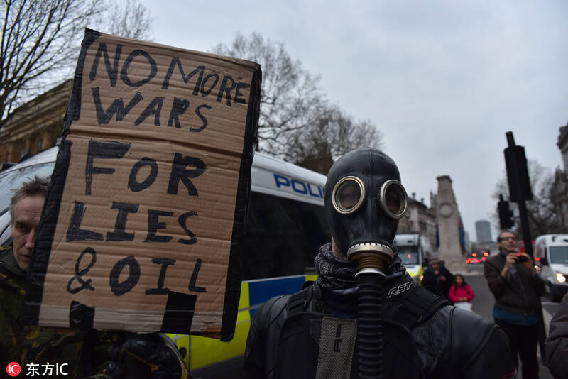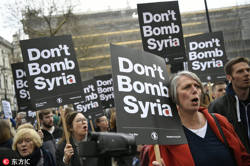 英国伦敦,当地数百名中在唐宁街上示威游行,举牌抗议政府介入叙利亚混乱局势,反对对叙利亚动武。