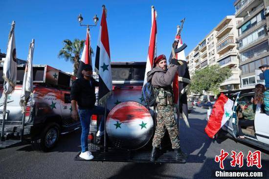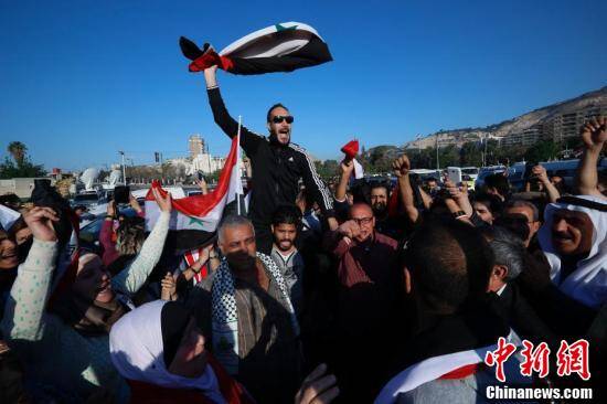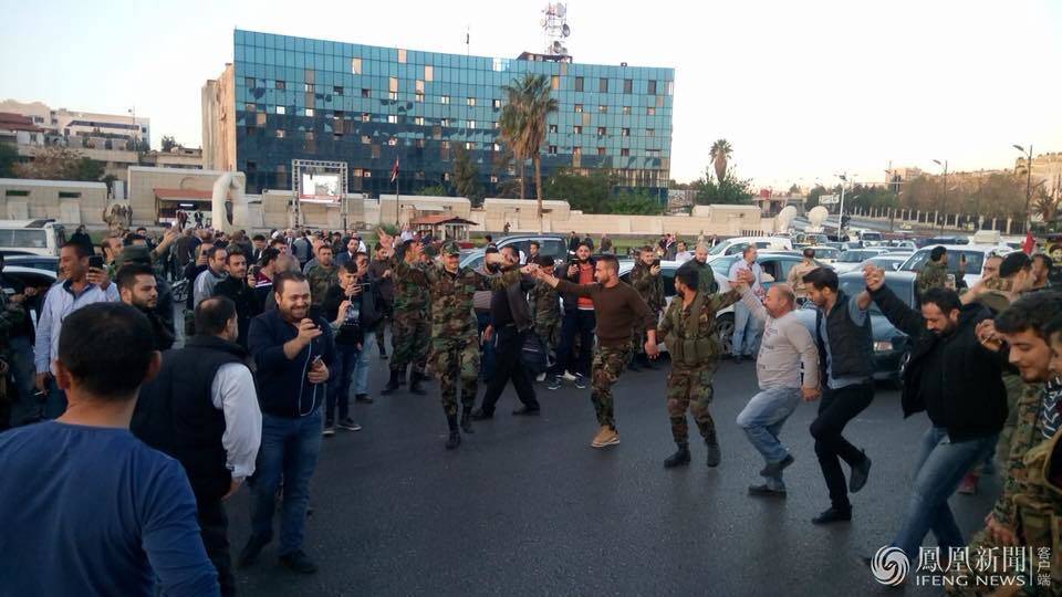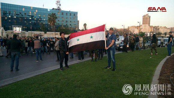 4月14日早晨,经历凌晨美英法三国空袭的大马士革,数百名居民聚集在阿曼德广场,许多人挥舞着叙利亚、俄罗斯和伊朗国旗和胜利的标语。有些人拍手跳舞,另一些人开着车鸣笛。
