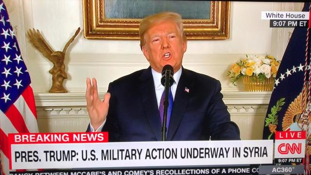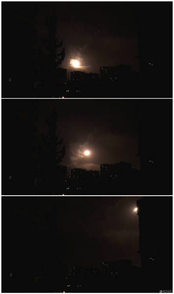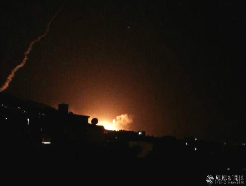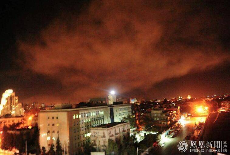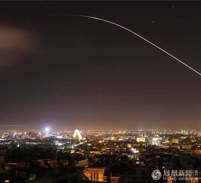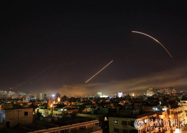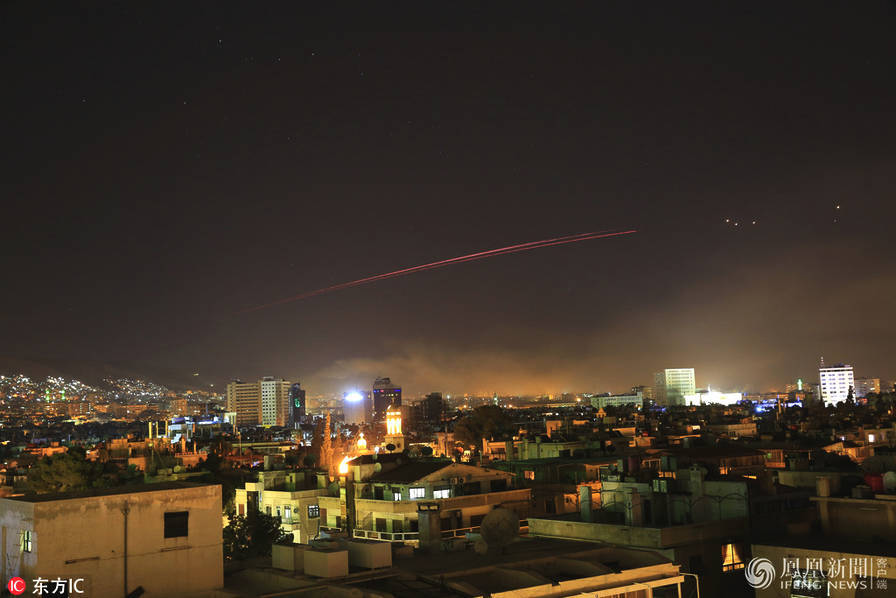 4月14日报道,当地时间周五(13日)晚间,美国总统特朗普就叙利亚化学武器袭击事件发表讲话,宣布对叙利亚实施精确打击。图为14日凌晨叙利亚拦截美国导弹画面。图片来源:Arturas Kerelis
