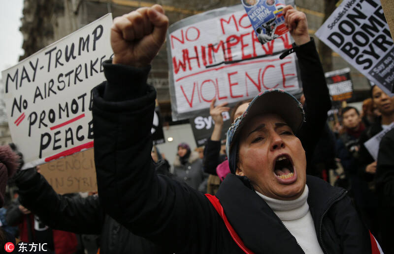 一部分民众在街头发起示威游行,抗议美国联合英法两国对首都大马士革发起空袭行动。