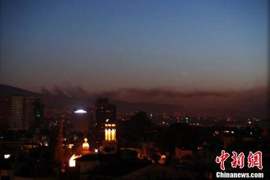 2018年4月14日,叙利亚首都大马士革不同地区遭遇空袭后烟雾升起。