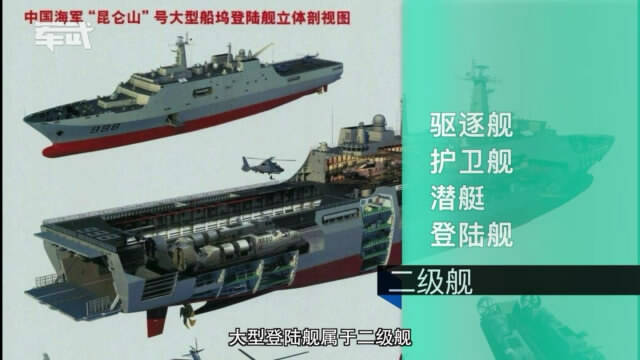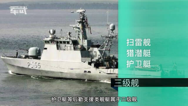 目前海军舰艇命名条例,按照吨位和作战用途将舰艇分为三个等级,其中航母、战列舰、核潜艇属于一级舰;护卫舰、驱逐舰、大型登陆舰二级舰;猎潜舰,护卫艇、后勤支援类舰艇属于三级舰。
