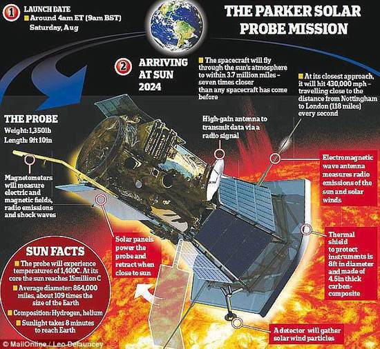 报道称,“帕克”号将直接飞入太阳的大气层,到达距离太阳表面约643万公里的地方,探索和观测太阳高能粒子和太阳风。