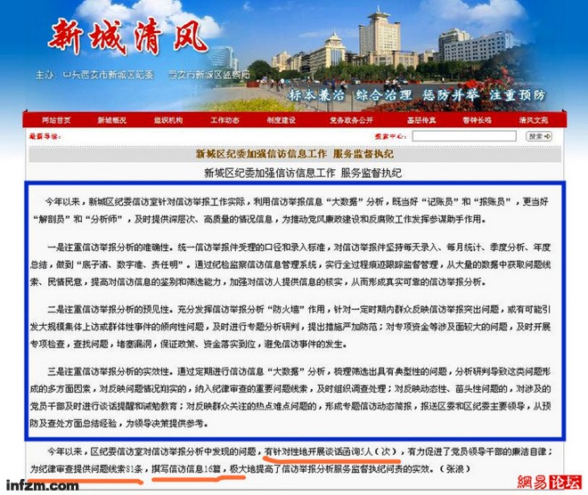 西安市新城区的这篇文章,发布在西安市新城区纪委、新城区监察局的官网“新城清风”上,题目是“新城区纪委加强信访信息工作,服务监督执纪”。文章提到,“今年以来,新城区纪委信访室……利用举报信息‘大数据’分析,既当好‘记账员’和‘报账员’,更当好‘解剖员’和‘分析师’。”接下来,文章从注重信访举报分析的准确性、预见性和实效性来展开。这篇帖子的发布时间是2015年9月9日。