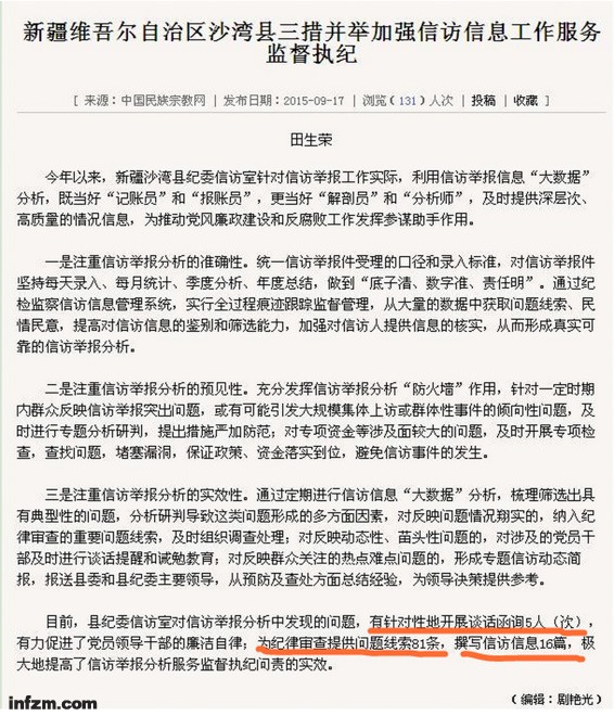 如果说谋篇布局和行文的雷同只是响应同样的政令和工作要求,向上级“表态”的话,那具体工作中的数字雷同就说不过去了。发表在“中国民族宗教网”上的这篇题为“新疆维吾尔自治区沙湾县三措并举加强信访信息工作服务监督执纪”的文章,除了文字表达上的相似之外,在数字方面也与西安新城区的一样。发布日期是2015年9月17日——如果是抄袭的话,这篇文章在“抄袭食物链”的下层。