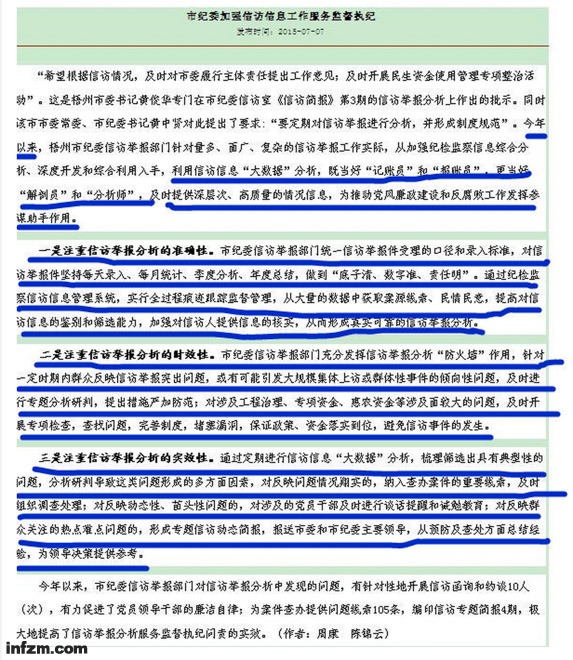 要论先来后到的话,广西省梧州市纪委的同题文章显然更早——它的发布时间是2015年7月7日。粗略一瞥,上文跟它的表述如出一辙:大数据、记账员、报账员、解剖员、分析师……细看之下,具体行文也只是个别字词略有不同。