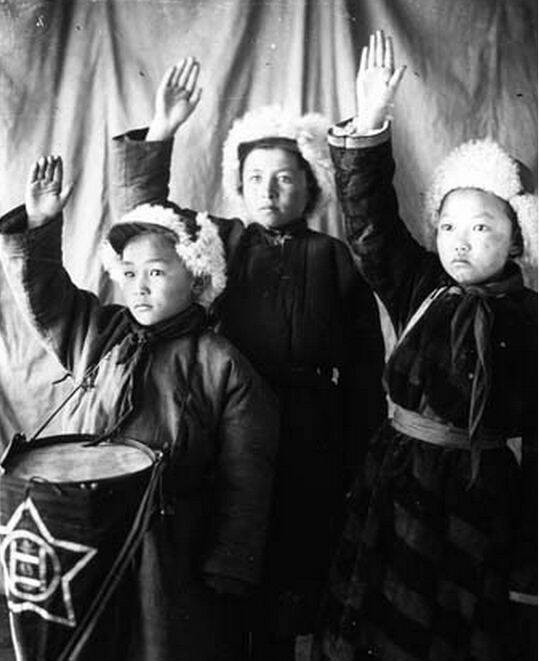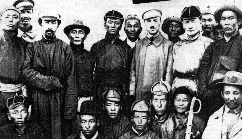 1911年(清宣统三年),辛亥革命后,随着清朝统治的逐渐瓦解,在沙皇俄国驻库伦(现乌兰巴托)领事的策动下,外蒙古活佛八世哲布尊丹巴派杭达多尔济、车林齐密特出使俄国,后在库伦宣布独立,建立“大蒙古国”政府,自称日光皇帝,年号共戴。随后俄蒙军队包围了清政府驻库伦的蒙古办事大臣衙门,解除了清军的武装,并将办事大臣三多及其随从人员押送出境。图为早期外蒙古的人民党成员。