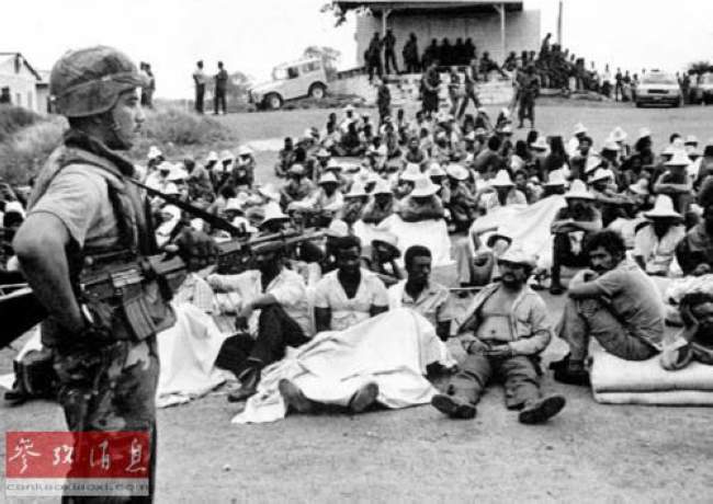 西班牙《阿贝赛报》发表文章,盘点了最近几十年美国领导实施的十次重大军事干预行动,它们分别为:1.格林纳达:1983年10月25日,为了应对格林纳达副总理伯纳德·科尔德发起的政变,美国和几个加勒比国家发起代号为“暴怒”的军事行动,入侵格林纳达岛。时任美国总统罗纳德·里根声称这次行动的目的是保护生活在格林纳达岛上的大约1000位美国公民,结束政变后的混乱局势。图为:美军在格林纳达。(图片来源:新华网,注释来源:新华网)