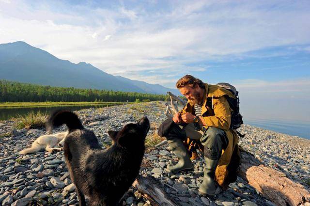 清晨,泰松阅读、写文章,下午,他探索他的领域,在森林游走。在这里,一位防护林的巡逻员把两只4个月大的狗送给了泰松当礼物。那时,他对狗还是怀有防备之心。然而当有熊靠近,这两只狗就会吠叫。图为冬季泰松在贝加尔湖上的冰洞里洗澡。