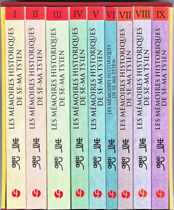 据《欧洲时报》7月31日消息,新出版的《史记》法文版全套共九卷,由巴黎巴黎友丰书局的潘立辉先生主持编列。这套《史记》法文版由三部分构成:沙畹已翻译的五卷、法国高等研究院学术导师康德谟补译的《荆燕世家第二十一》和《齐悼惠王第二十二》,以及汉学家雅克·班岜诺教授续译的“列传”部分,其中新译出部分占整个《史记》篇幅近一半。