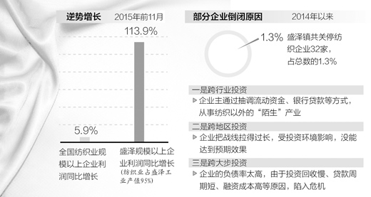 “但是,仔细分析这些倒闭企业,并不是因为搞纺织造成的,原因主要集中在‘三跨’。”盛泽镇党委副书记赵菊观说,一是跨行业投资,企业主通过抽调流动资金、银行贷款等方式,从事纺织以外的“陌生”产业;二是跨地区投资,企业把战线拉得过长,受投资环境影响,没能达到预期效果;三是跨大步投资,企业的负债率太高,由于投资回收慢、贷款周期短、融资成本高等原因,陷入资金链危机。