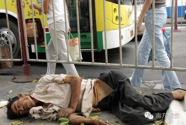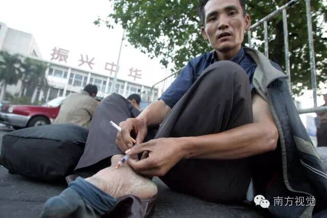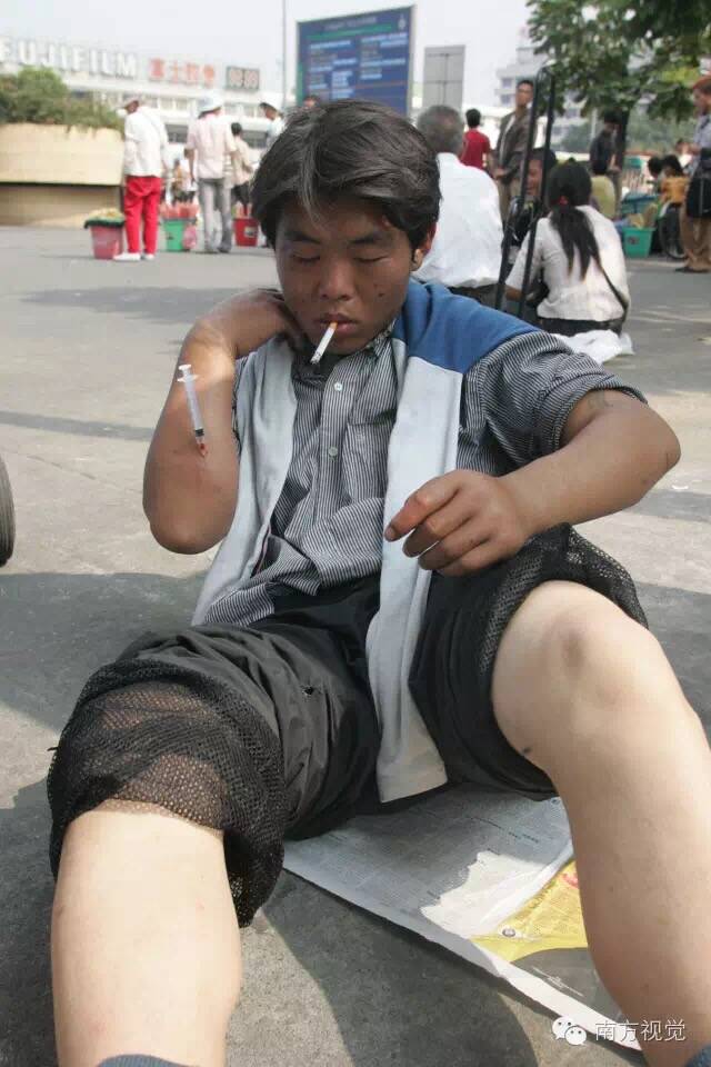 2004年10月13号,一个在广州火车站“混”的湖南籍吸毒者在众目睽睽之下“扎针”。