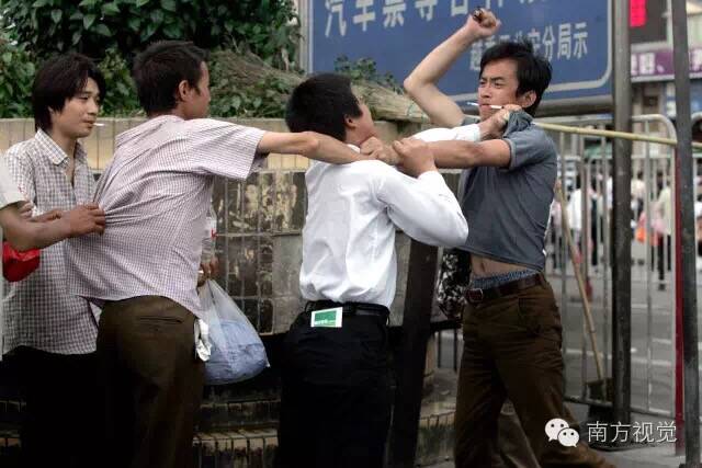 2005年5月14日,外号“佳木斯”吸毒者(右)成功敲诈一名旅客后,与其他几名吸毒者分赃不匀,争打起来。打架,在当时的广州火车站广场司空见惯。