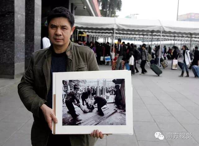 现今,记者梁文祥站在火车站广场,手举十几年前在这个地方拍下的一张吸毒者死后尸体被搬走的图片,如今身后的火车站秩序井然,吸毒者早已不见踪影。