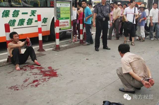 2004年5月,敲诈不成反被砍伤。左边这名来自西北的吸毒者在火车站广场上的公交车总站敲诈一名旅客,反被旅客打伤,血流满地,警察赶来将这名旅客用手铐铐住。