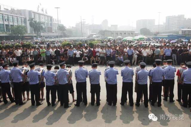 年复一年的“专项整治”中,相关领导甚至立下“军令状”;“剑兰行动”成为一帖猛药,在紧随其后的“禁摩”风里,广州火车站开始了“秋风扫落叶”式的清理。最后的一场洗礼是2008年初的南方冰灾,让铁路部门从此深谙“分流与秩序”的分量。图为2005年11月,广州火车站大力整治期间,越秀区在广场上对一批在火车站及周边地区犯恶分子进行宣判。