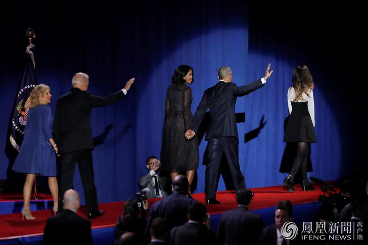 奥巴马和米歇尔牵手甩着走向幕后,边走边甩手。副总统拜登及其夫人走在后面。