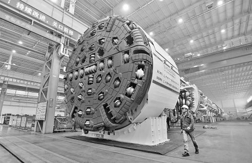 1月11日,一名工人从铁建重工新疆有限公司硬岩掘进机总装车间一台正在总装的盾构机前走过。该公司2016年7月建成投产,是疆内唯一隧道施工用高端装备制造企业。□本报记者周鹏摄