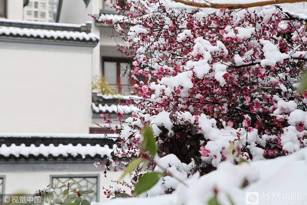 2月9日,江苏常州市荆川公园,陈渡草堂内外的梅花在雪中绽放,吸引市民前来观赏拍照。