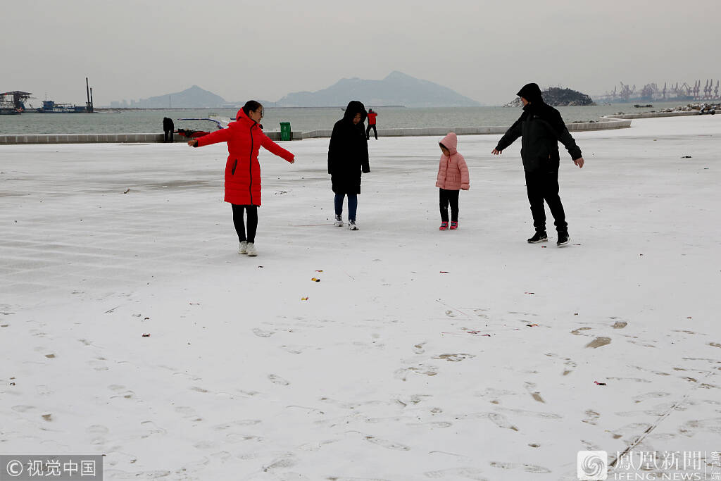 2月9日,江苏连云港,市民在东部海滨城区在海一方公园踏雪游玩。
