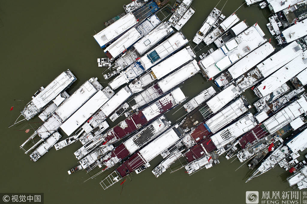 2月9日,江苏淮安。雪后的洪泽湖渔港。当日,淮安市出现大雪天气,雪后的洪泽湖渔港千条船只依次停泊,船头的红旗在风中飘扬,十分壮观。